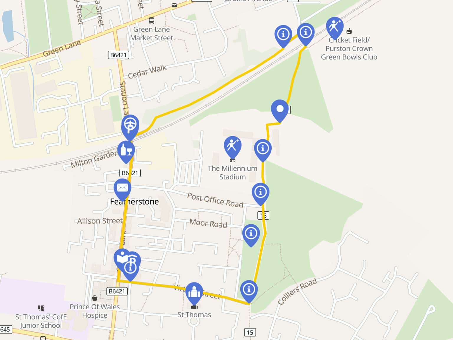 Circular walk from Featherstone Library via the sports fields