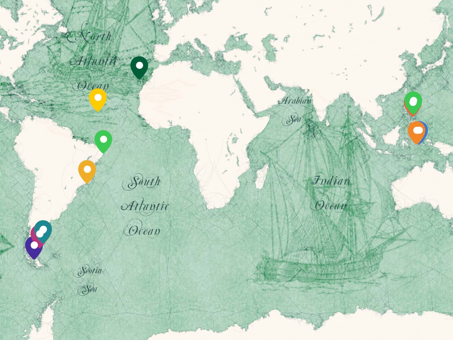 Los descubrimientos durante la primera vuelta al mundo según su localización geográfica.